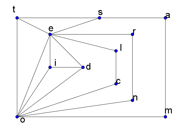 As arestas destes grafos representan un par de letras adxacentes. Cales serán as arestas máis frecuentes en galego?, e noutras linguas? Poderán determinarse a lingua en que vén redactado un texto estudando o tipo de arestas máis frecuentes do mesmo? Todo un extravagante campo de traballo para a lingüística informática.